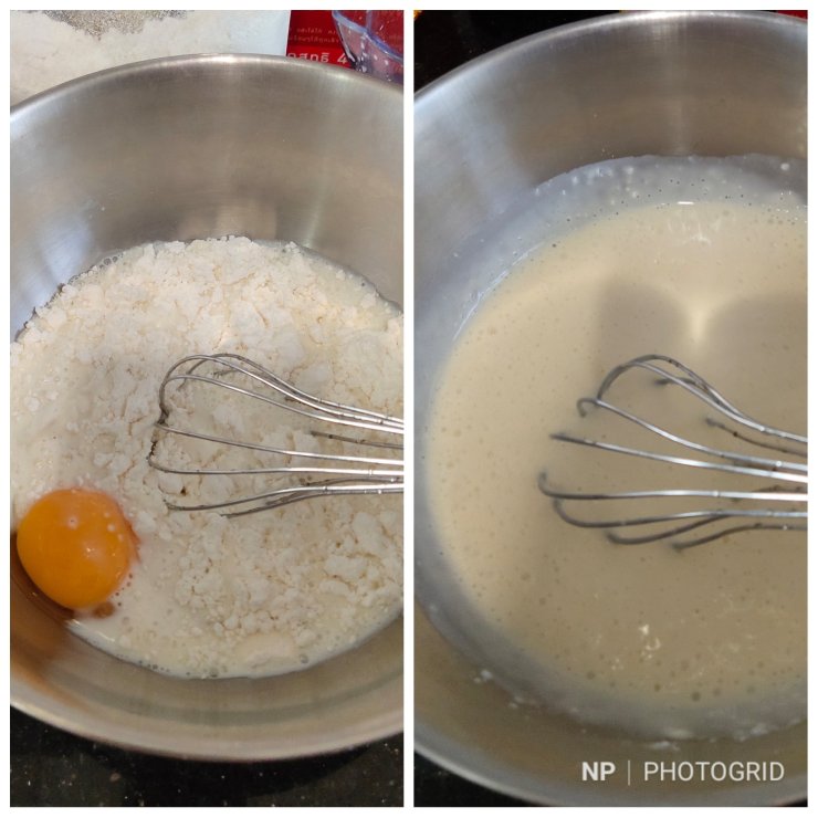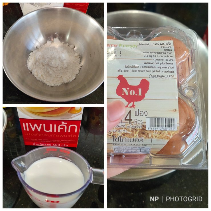 ตวงแป้ง ตวงนม เตรียมแป้ง ตามสูตรข้างกล่องแป้งแพนเค้กเลยจ้ะ
